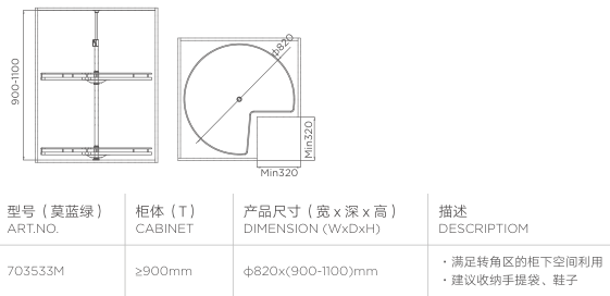 为转角而设,360°旋转设计,物体藏再深亦能轻松拿取。